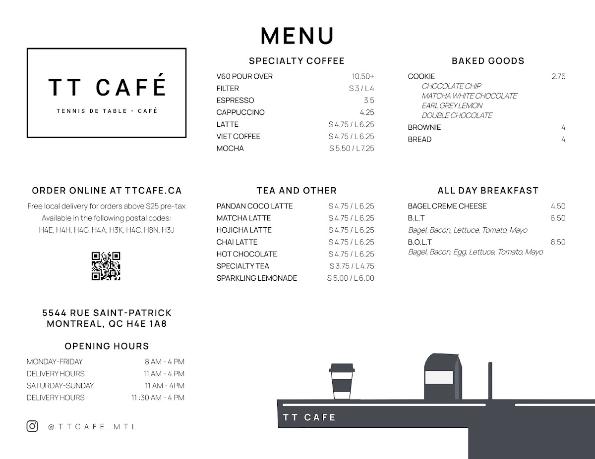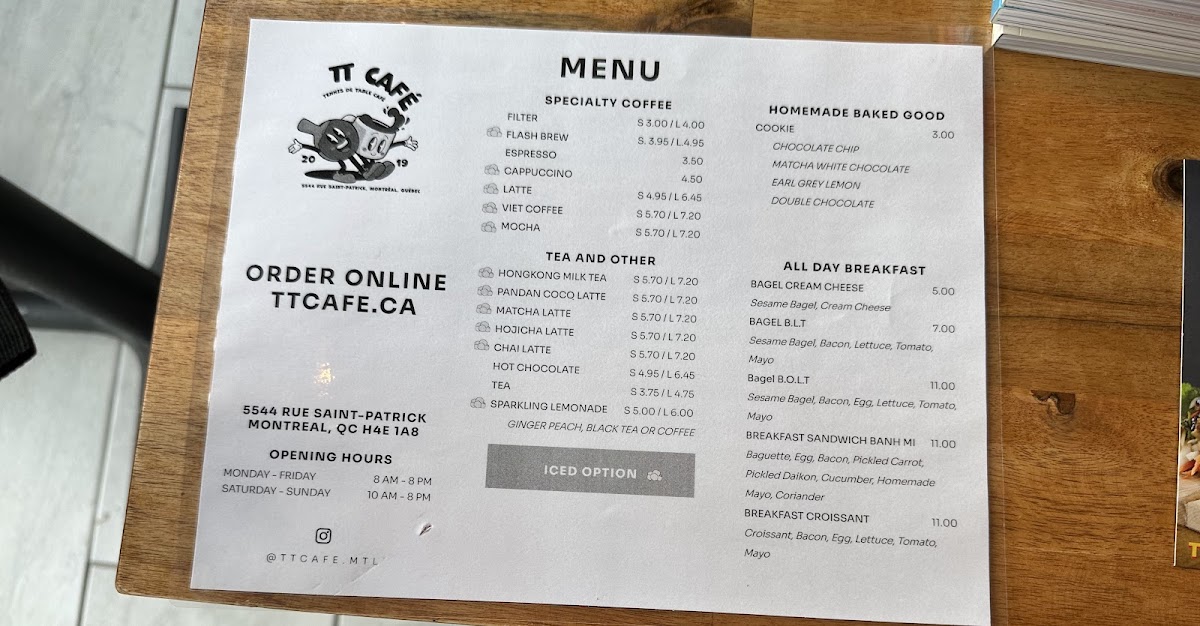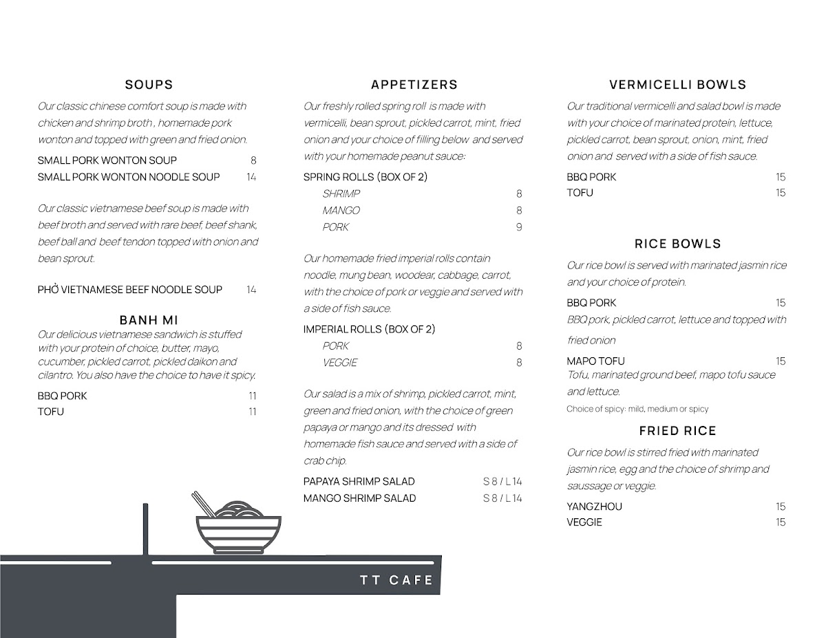 From a reviewer’s perspective, the menu at Tt Café feels like a thoughtful fusion of comfort, balance, and everyday versatility, making it easy to understand why this spot appeals to such a wide audience. The beverage selection sets a warm and inviting tone, ranging from soothing options like Hojicha Latte, Matcha Latte, and Hong Kong Milk Tea to refreshing choices such as Sparkling Lemonade and the aromatic Pandan Coco Latte, while coffee lovers are well covered with Viet Coffee, Espresso, Cappuccino, Mocha, and Filter Coffee. On the food side, the menu moves seamlessly from light to hearty. Classic Vietnamese-inspired soups like Wonton Soup (Entree Size) and Wonton Noodle Soup (Meal Size) provide comforting depth, while fresh salads such as Chicken Salad, BBQ Pork Salad, Tofu Salad, and Shrimp Salad offer lighter, well-rounded alternatives. The all-day breakfast selection, including Bagel B.O.L.T., Bagel B.L.T., Breakfast Croissant, Bagel Cream Cheese, and Breakfast Banh Mi, makes the café an easy choice at any hour, complemented by simple baked treats like Cookie for a sweet finish. For more substantial meals, diners can choose from flavorful Imperial Rolls (Box of 2) and Spring Rolls (Box of 1), followed by satisfying rice and vermicelli bowls such as Rice Tofu, Rice BBQ Pork, Rice Chicken, Vermicelli Chicken, Vermicelli Tofu, and Vermicelli BBQ Pork. The Banh Mi lineup-Banh Mi Tofu, Banh Mi BBQ Pork, Banh Mi General Tao Chicken, and Banh Mi Chicken-ties everything together, reinforcing the café’s identity as a place where familiar flavors are presented with care and consistency. Overall, the menu reads as a cohesive summary of what Tt Café does best: approachable drinks, comforting meals, and flexible options that suit both quick visits and relaxed sit-down moments.